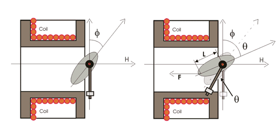 Supongamos que cuando no hay corriente a través de la bobina, el puntero está en cero, el ángulo que forma el eje del disco de hierro con la línea perpendicular al campo es . Ahora la corriente debida I y la correspondiente campo magnético la pieza de hierro se desvía a un ángulo. Ahora el componente de H en la dirección del eje del disco de hierro defendido es Hcos{90 ( + ) o Hsin ( + ). Ahora la fuerza F que actúa en el disco hacia adentro de la bobina es por lo tanto proporcional a H2sin( + ) por lo tanto la fuerza es también proporcional a I2sin( + ) para una permeabilidad constante. Si esta fuerza actúa en el disco a una distancia l del pivote, entonces el par de desviación,