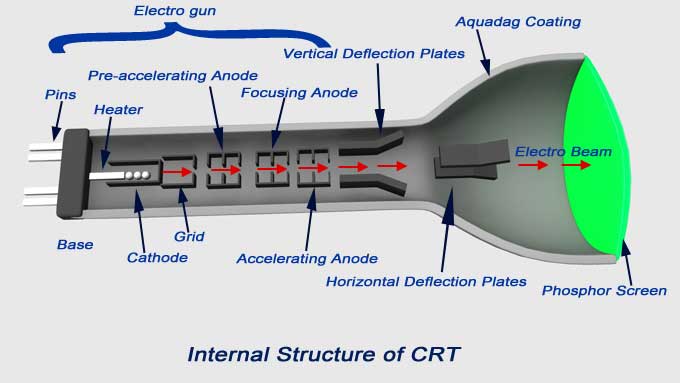 Así que la cantidad de entrada que hemos hablado anteriormente es el voltaje. Hoy en día, con la ayuda de transductores es posible convertir varias cantidades físicas como actualpresión, aceleración, etc. a la tensión, por lo que nos permite tener una representación visual de estas diversas cantidades en osciloscopio de rayos catódicos. Ahora veamos los detalles constructivos del osciloscopio de rayos catódicos.