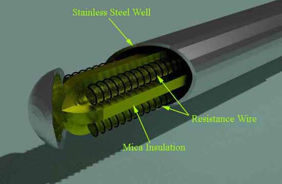 Esto también es útil para el mantenimiento de la RTD mientras la planta está en funcionamiento. La mica se coloca entre la cubierta de acero y el cable de resistencia para un mejor aislamiento eléctrico. Debido a la menor tensión en el alambre de resistencia, debe ser cuidadosamente enrollado sobre la hoja de mica. La fig.2 muestra la vista estructural de un Detector Industrial de Temperatura de Resistencia.