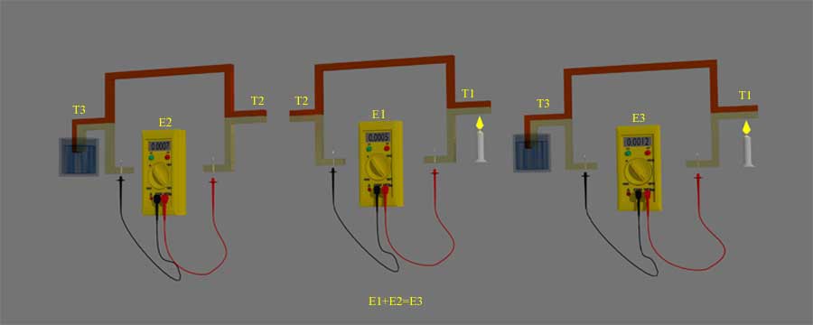 La tercera ley, las temperaturas sucesivas o intermedias, donde el CEM E1 se genera cuando dos metales diferentes se unen a temperaturas T1 y T2 y EMF E2 resultados para las temperaturas T2 y T3. De ello se deduce que un EMF E1 y E2 resultados en los terminales de salida cuando las uniones están a temperaturas T1 y T3. Este principio permite que las curvas de calibración derivadas para una determinada temperatura de unión de referencia se utilicen para determinar las curvas de calibración para otra temperatura de referencia.