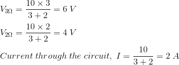 Tensión a través de 2 es V2 = 10 3 2 = 4 V y voltaje a través de 2A fuente de corriente es V2A = 10 4 = 6 V