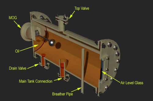 Cuando el volumen de aceite aislante de los transformadores aumenta debido a la carga y a la temperatura ambiente, el espacio vacío por encima del nivel de aceite dentro del conservador es ocupado parcialmente por el aceite expandido. En consecuencia, la cantidad correspondiente de aire de ese espacio se aleja a través del respiradero. Por otra parte, cuando la carga del transformador disminuye, el transformador se apaga y cuando la temperatura ambiente disminuye, el aceite del interior del transformador se contrae. Esto hace que el aire exterior entre en el tanque conservador del transformador a través de un respiradero de gel de sílice.